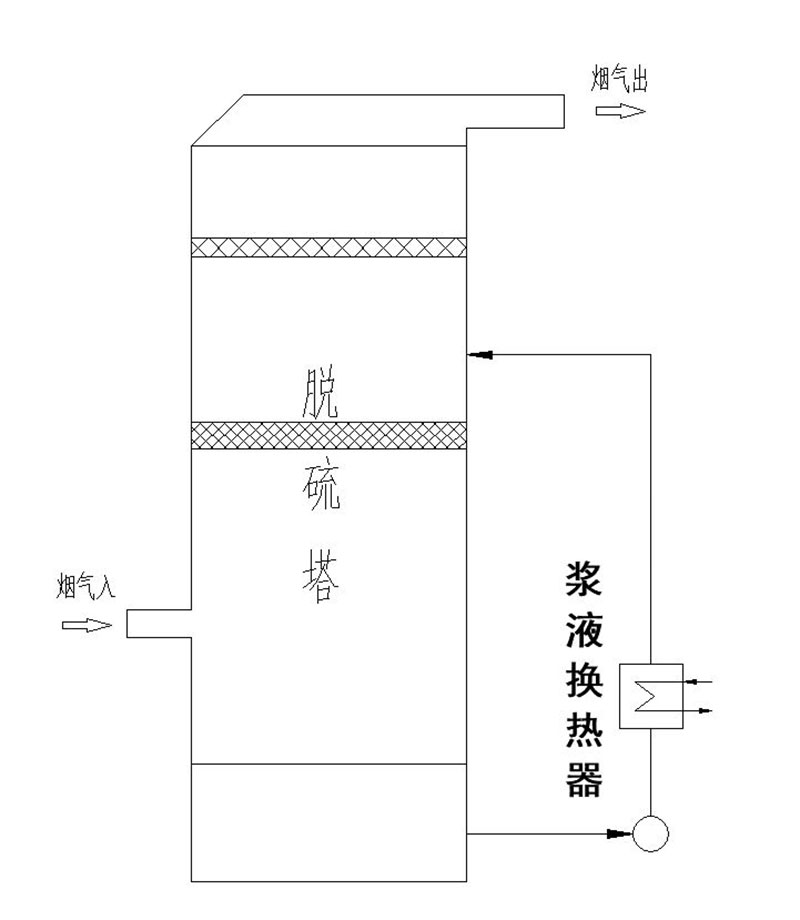 漿液冷凝法是濕法脫硫消除白色煙羽的主要技術(shù)方案之一,其主要特點是利用漿液換熱器將漿液與循環(huán)水或其他冷卻介質(zhì)進行換熱,這樣降低了脫硫塔內(nèi)漿液的溫度,由于漿液溫度的降低脫硫塔內(nèi)煙氣的溫度也同時降低,煙氣的溫度降低,大大降低了煙氣攜帶可凝物的攜帶量,這樣就消除了煙氣的白色煙羽,也有部分客戶將這部分熱量換熱到循環(huán)水當中,循環(huán)水的溫度再繼續(xù)進行深度的余熱回收,這樣就同時兼具了白色煙羽的消除和余熱回收的功能,用鈣法濕法脫硫,