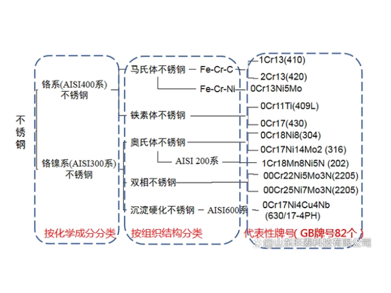 所以我們的科研人員就根據(jù)增加鉻元素的含量不同以及添加鎳、硅、銅等稀有金屬元素的組成不同將不銹鋼設(shè)計(jì)成了很多類,總結(jié)就分為兩類鉻系不銹鋼以及鉻鎳系不銹鋼,鉻系不銹鋼主要是馬氏體不銹鋼以及鐵素體不銹鋼,這兩種不銹鋼在工業(yè)中很少應(yīng)用,主要應(yīng)用在廚房以及家用電器產(chǎn)品當(dāng)中,我們工業(yè)中主要應(yīng)用的還是奧氏體不銹鋼、雙向不銹鋼以及沉淀硬化的不銹鋼,這里最典型的奧氏體不銹鋼,是我們大家都認(rèn)識(shí)的3系不銹鋼,比如304、316,雙向不銹鋼就包含了2205/2507等不銹鋼。