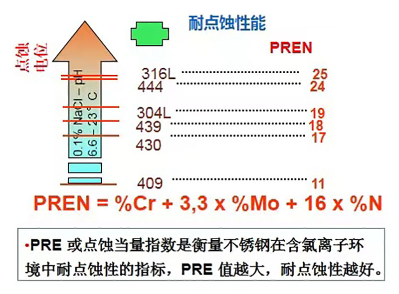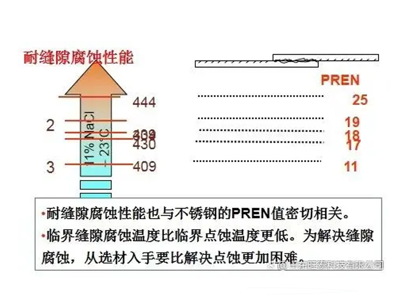 縫隙腐蝕避免的措施主要有:結(jié)構(gòu)上避免產(chǎn)生縫隙、定期清洗以及流速涉及的相對(duì)比較高,同時(shí)也是選用耐腐蝕當(dāng)量比較高的不銹鋼,以40系不銹鋼為例,那么444比409的耐腐蝕當(dāng)量更要高,在工業(yè)當(dāng)中一般是選擇雙相不銹鋼,它的耐腐蝕大概要遠(yuǎn)遠(yuǎn)高于40系以及30系不銹鋼。