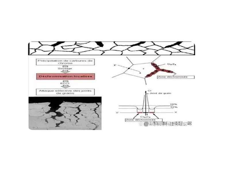 三、晶間腐蝕:晶間腐蝕是沿分子晶間開始腐蝕向周圍擴(kuò)散的腐蝕現(xiàn)象叫晶間腐蝕。晶間腐蝕產(chǎn)生的主要原因是不銹鋼在450度到850度之間有敏化溫度,那么在敏化溫度的工作條件下,沿分子晶間鉻化物析出導(dǎo)致分子周邊的貧鉻化物所以導(dǎo)致了晶間腐蝕。