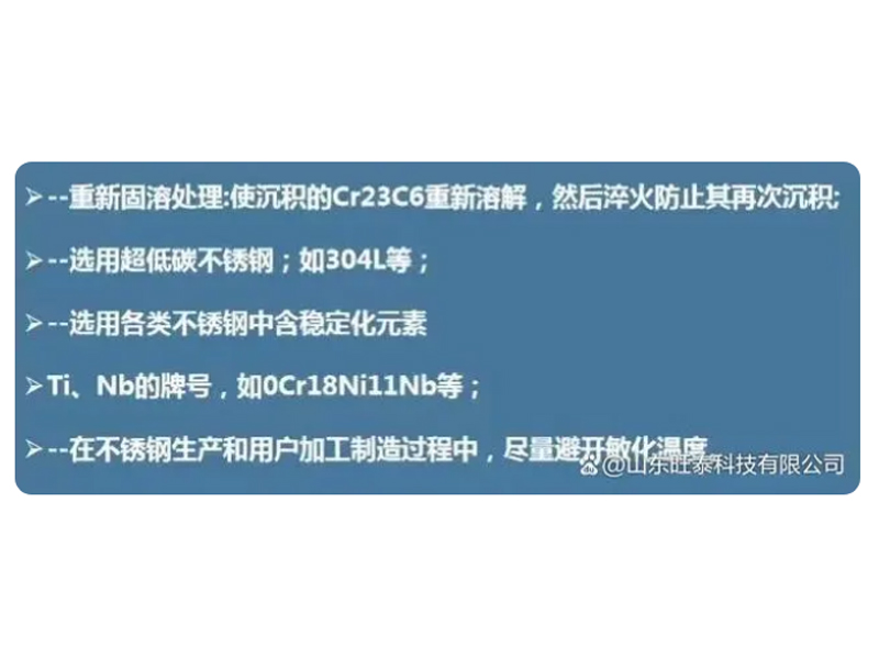 那么避免晶間腐蝕的措施有:不銹鋼一定選擇固容處理的不銹鋼,第二是選擇低碳不銹鋼,另外還有含肽泥等元素的不銹鋼。