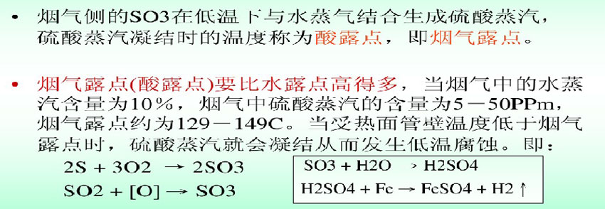燃料中的硫在燃燒后生成二氧化硫(SO2),其中有少量的SO2(只占SO2的1%左右)又會進一步氧化而形成三氧化硫(SO3)。由于三氧化硫在煙氣中存在,則使煙氣的露點溫度升高,即三氧化硫和煙氣中水蒸氣化合,生成硫酸蒸汽,露點溫度大為升高。當含有硫酸蒸汽的煙氣流經(jīng)低溫受熱面(空氣預熱器),受熱面金屬壁溫低于硫酸蒸氣的露點時, 則在受熱面金屬表面結硫酸露(也即在預熱器低溫冷端波紋板上結硫酸露),并腐蝕受熱面金屬。