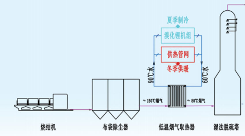 目前,低溫?zé)Y(jié)機的煙氣經(jīng)除塵脫硫脫硝直接外排至大氣中,除塵后煙氣仍有150℃左右,而脫硫最優(yōu)溫度區(qū)間在60℃左右,除塵后的煙氣余熱未得到有效的回收利用。