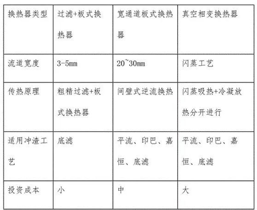 高爐沖渣水的主要利用方式是通過渣水換熱器將沖渣水的余熱提取出來加以利用,沖渣水換熱必須解決其對換熱器造成的污染、堵塞以及腐蝕這三個主要問題。目前鋼鐵企業(yè)沖渣水換熱器主要采用過濾器加板式換熱器、寬通道板式換熱器和真空相變式換熱器等幾種形式。