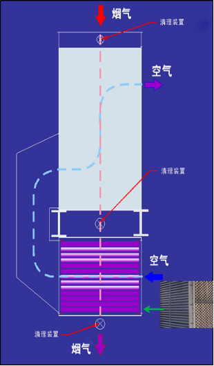 設(shè)備整體結(jié)構(gòu)如圖所示,煙氣自上向下流出,空氣側(cè)進側(cè)出,熱冷流體采用交錯流形式,可使流體全截面進出,換熱效率高、壓降?。话迨綋Q熱器溫差大,換熱效果高;設(shè)備換熱面積小,占地小,設(shè)備更緊湊。