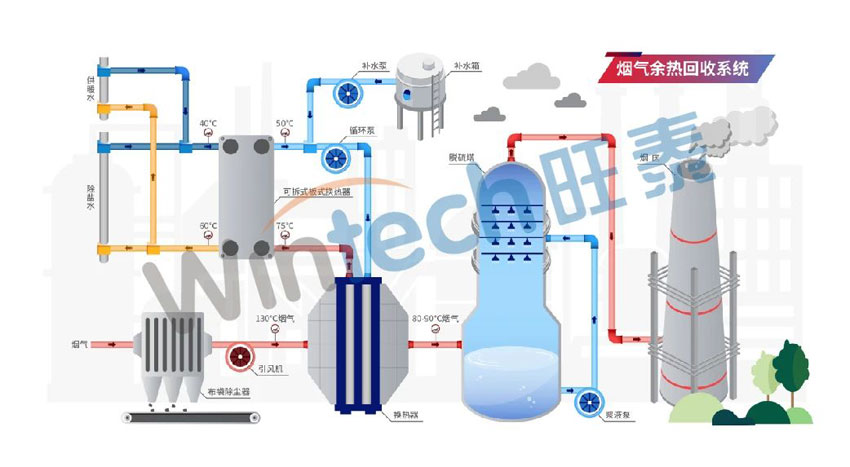 脫硫塔漿液溫度一般在 60℃左右,我司自主研制的漿液換熱器,在脫硫塔循環(huán)泵出口管道加裝漿液換熱器,漿液直接加熱供暖回/補水或除鹽水,進(jìn)行余熱回收利用;漿液溫度降低冷卻后的漿液與煙氣逆流接觸換熱使排煙溫度降低,煙氣蒸發(fā)水量減少,同時起到脫白和降低水耗的效果。
