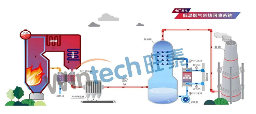 為了有效降低排煙溫度,提高鍋爐熱效率,電廠紛紛引入并創(chuàng)新應(yīng)用煙氣余熱回收技術(shù)。旺泰科技針對電廠煙氣余熱回收研發(fā)除塵后低溫?zé)煔庥酂峄厥障到y(tǒng)以及脫硫塔后漿液余熱回收系統(tǒng)技術(shù)等,通過不同的換熱方式將煙氣中的熱量轉(zhuǎn)化為可二次利用的能源,實現(xiàn)了能源的梯級利用和高效回收。