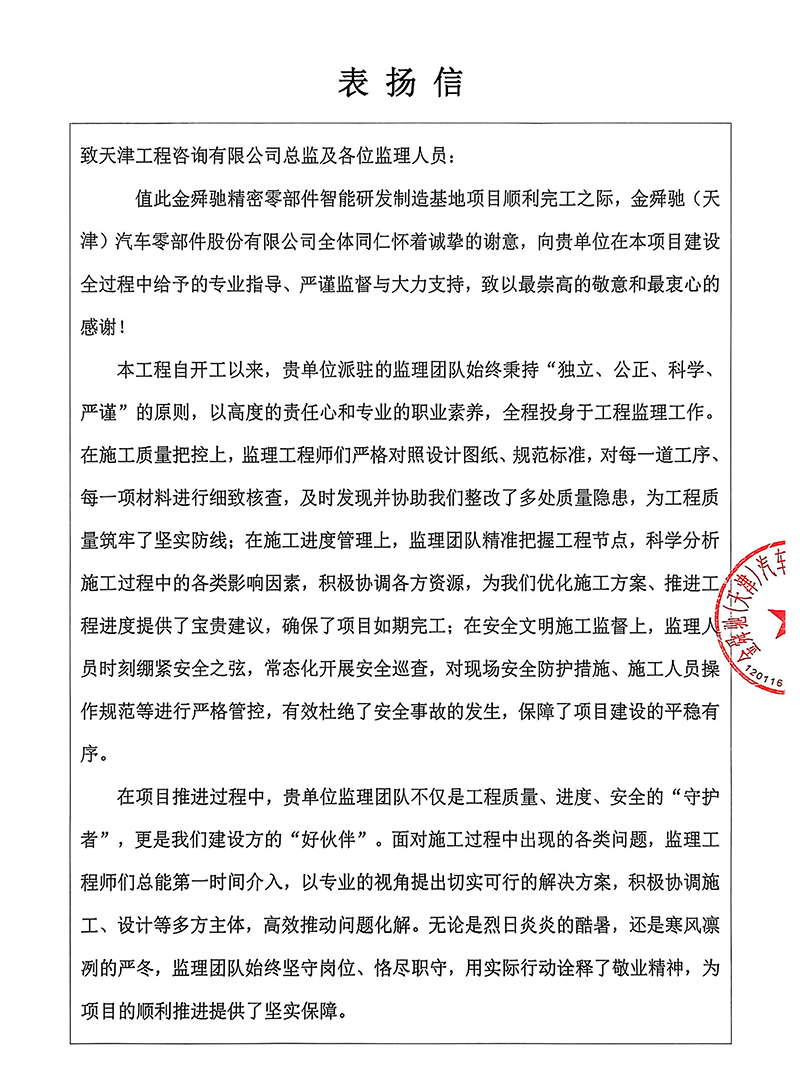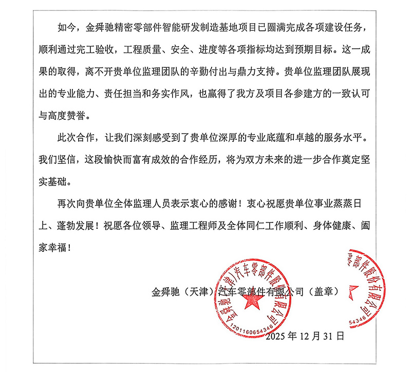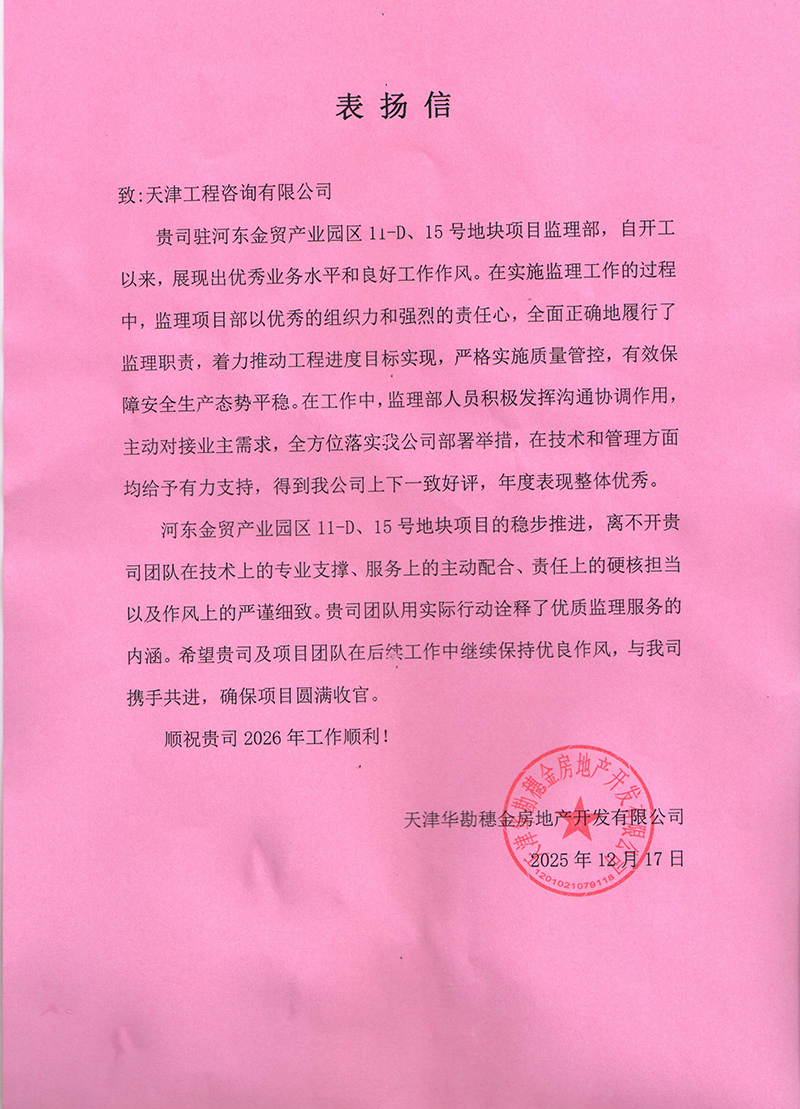 天津華勘穗金房地產(chǎn)公司、中同銀龍(天津)公司也先后發(fā)來(lái)表?yè)P(yáng)信,對(duì)天津咨詢河?xùn)|金貿(mào)產(chǎn)業(yè)園區(qū)11-D、15號(hào)項(xiàng)目團(tuán)隊(duì)和中同銀龍(天津)滅菌中心建設(shè)項(xiàng)目的監(jiān)理工作予以表?yè)P(yáng)感謝,認(rèn)為我司項(xiàng)目監(jiān)理部積極主動(dòng)對(duì)接業(yè)主需求,溝通協(xié)調(diào)參建各方,過(guò)程中加強(qiáng)技術(shù)管理支撐和質(zhì)量安全風(fēng)險(xiǎn)防控,用“事事落地、件件閉環(huán)”的擔(dān)當(dāng),筑牢項(xiàng)目落地的責(zé)任防線,用實(shí)際行動(dòng)詮釋了優(yōu)質(zhì)監(jiān)理服務(wù)的內(nèi)涵。