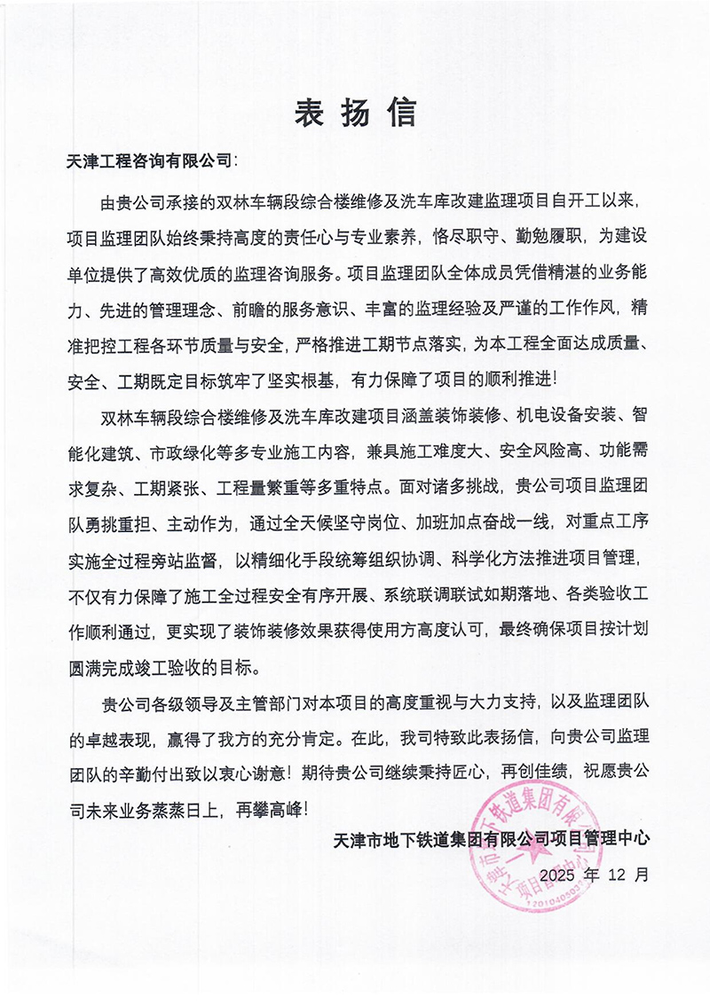 天津地鐵集團(tuán)發(fā)來(lái)表?yè)P(yáng)信,對(duì)天津咨詢雙林車(chē)輛段綜合樓維修及洗車(chē)庫(kù)改建監(jiān)理項(xiàng)目團(tuán)隊(duì)精細(xì)統(tǒng)籌協(xié)調(diào),高質(zhì)量攻克多專業(yè)施工難題給予充分肯定,認(rèn)為項(xiàng)目團(tuán)隊(duì)保障了施工安全有序和裝修呈現(xiàn)理想效果,助力項(xiàng)目圓滿完成驗(yàn)收。
