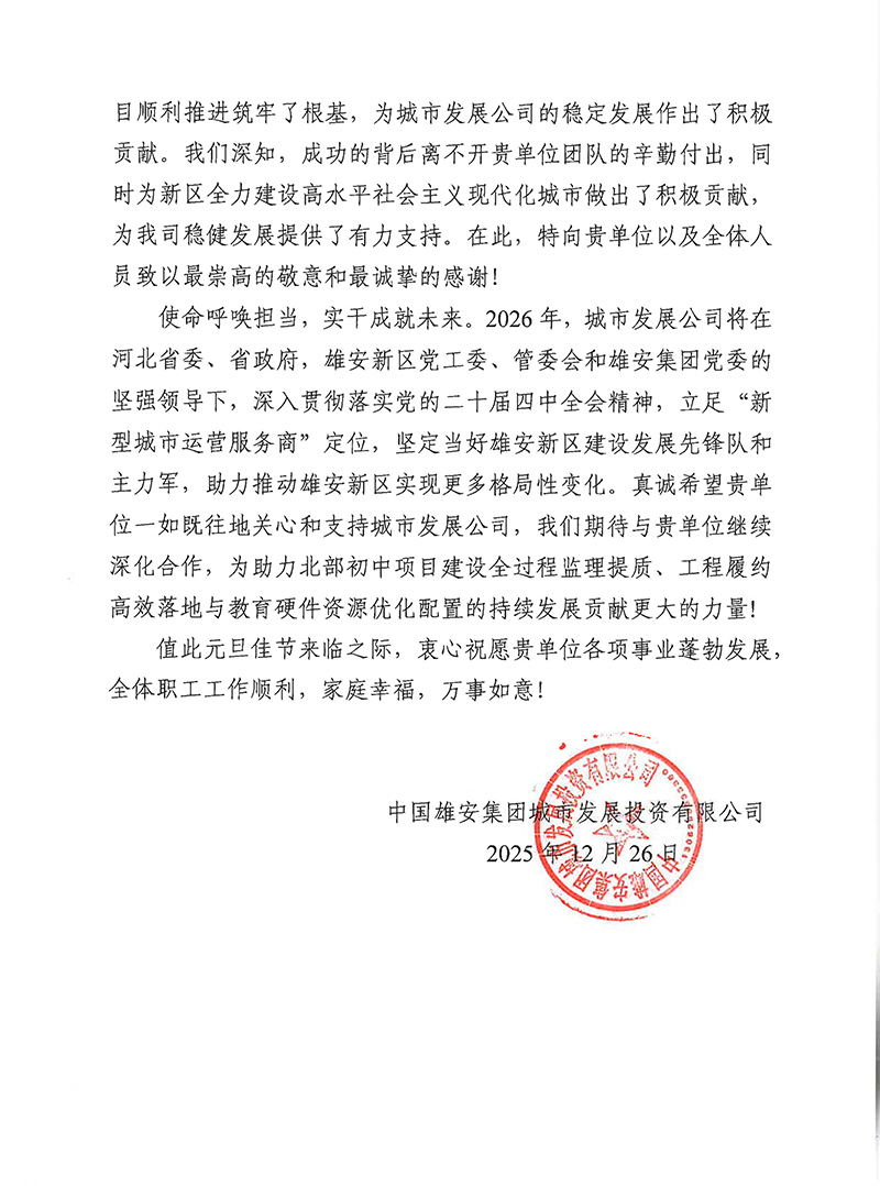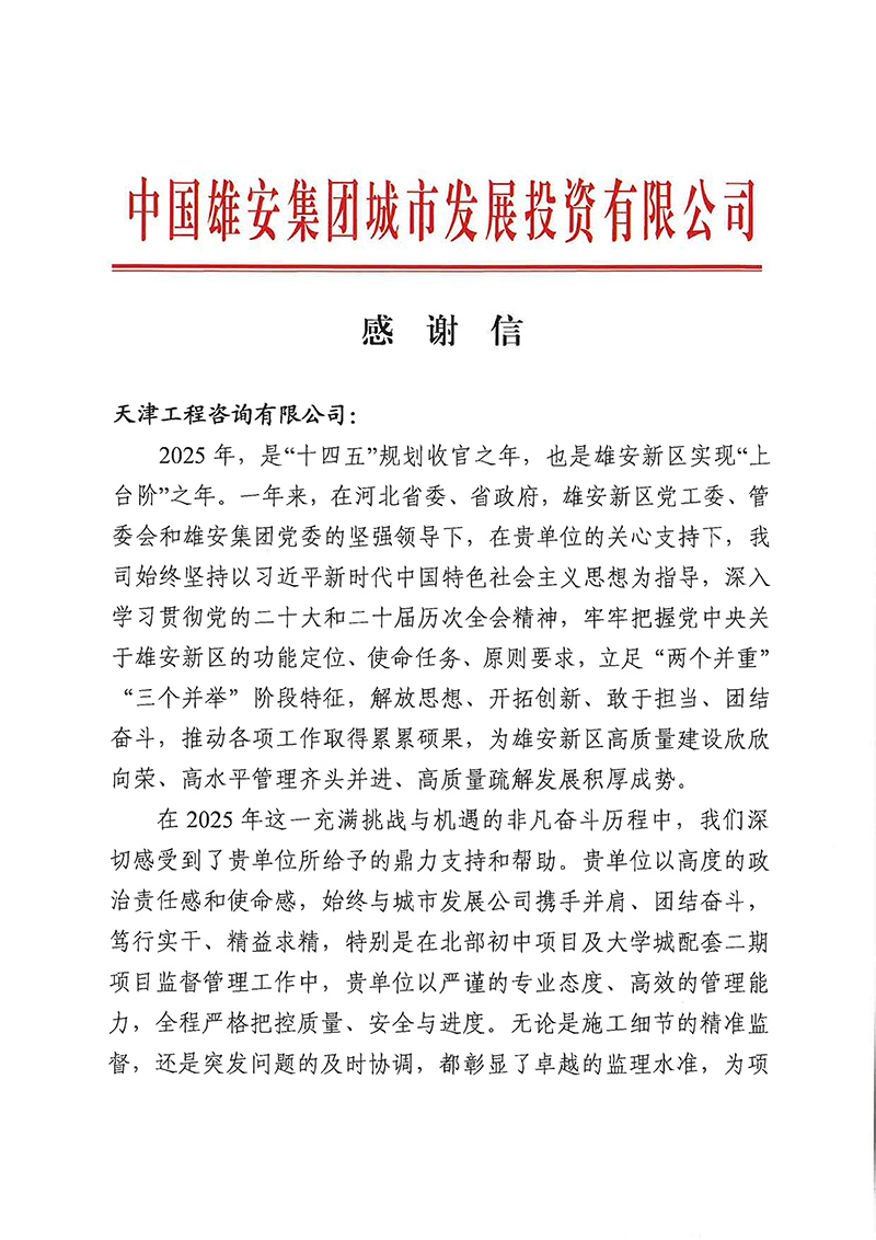 雄安集團(tuán)城發(fā)公司發(fā)來(lái)感謝信,對(duì)天津咨詢?cè)谛郯残聟^(qū)實(shí)現(xiàn)“上臺(tái)階”年之際,在北部初中、大學(xué)城配套二期項(xiàng)目監(jiān)理全過(guò)程中,以高度責(zé)任感和使命感,嚴(yán)控質(zhì)量安全進(jìn)度,精準(zhǔn)監(jiān)督施工細(xì)節(jié)、及時(shí)協(xié)調(diào)突發(fā)問(wèn)題,以專業(yè)、嚴(yán)謹(jǐn)、高效筑牢項(xiàng)目根基,為新區(qū)建設(shè)添力。