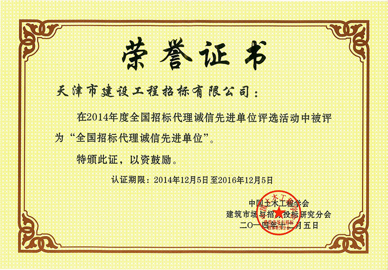 2014年全國(guó)招標(biāo)代理誠(chéng)信先進(jìn)單位