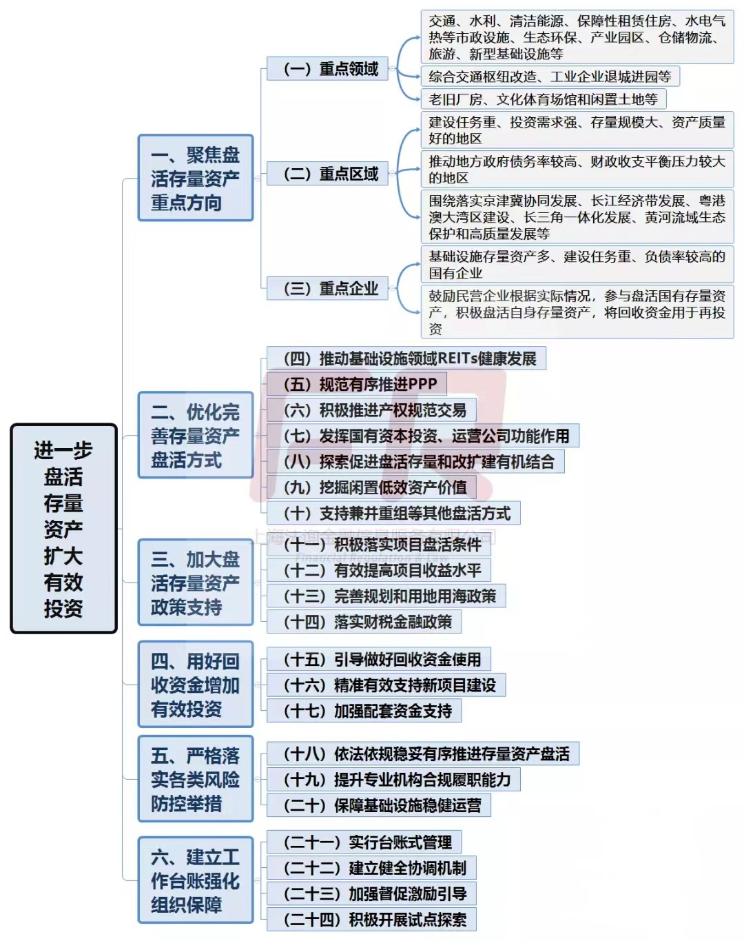 剛剛,國務院辦公廳發(fā)布《關于進一步盤活存量資產(chǎn)擴大有效投資的意見》(國辦發(fā)〔2022〕19號)。新規(guī)共提出24條意見,整體框架如下: